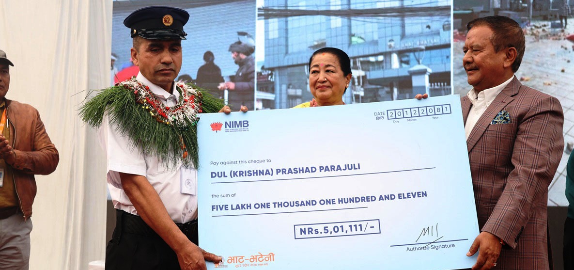 भाटभटेनीका सञ्चालक मीनबहादुर गुरुङले सुरक्षागार्ड पराजुलीलाई आज एक कार्यक्रमबीच पाँच लाख एक हजार एक सय एघार रुपैयाँसहित पुरस्कार र पाँच ग्रेड बढुवाको सम्मान प्रदान गरे ।