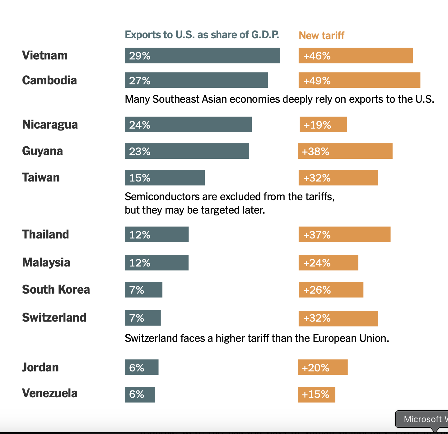 ती देशहरू वाशिंगटनको नयाँ व्यापक करहरूको लागि सबैभन्दा कमजोर मध्येका छन्। तिनीहरूको अर्थतन्त्र संयुक्त राज्य अमेरिकामा सामान बिक्रीमा गहिरो रूपमा निर्भर छ, र तिनीहरूमध्ये धेरैलाई विशेष गरी उच्च करको सामना गर्नुपरेको भन्दै न्यूयोर्क टाइम्सले विस्तृतमा तालिका सहित दिएको छ ।