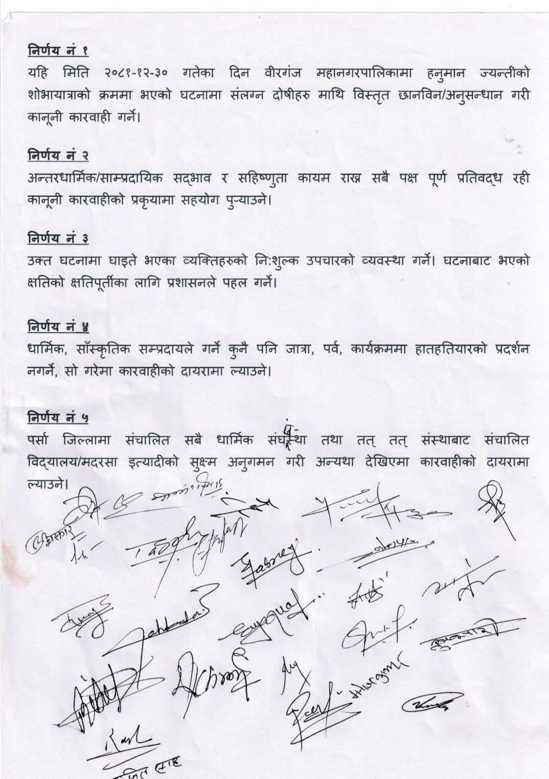 जिल्ला प्रशासन कार्यालय पर्साको पहलमा आइतबार दिनभर भएको सर्वपक्षीय भेलामा ५ बुँदे सहमति भएको हो।