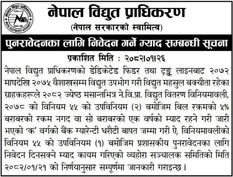 प्राधिकरणका अनुसार २०७२ माघदेखि २०७५ वैशाखसम्मको अवधिमा विद्युत सेवा लिएका तर बक्यौता रहेका ग्राहकले बिल रकमको ५ प्रतिशत बराबरको नगद वा त्यति नै मूल्य बराबरको एक वर्षे ‘क’ वर्गको बैंक ग्यारेन्टी धरौटीका रूपमा बुझाएर पुनरावेदन गर्न सक्ने व्यवस्था गरिएको छ ।