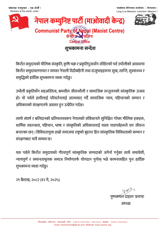 काठमाडौं २९ बैशाख । माओवादी केन्द्रका अध्यक्ष तथा पूर्वप्रधानमन्त्री पुष्पकमल दाहाल ‘प्रचण्ड’ले आज परेको उभौली पर्वको शुभकामना दिएका छन्।