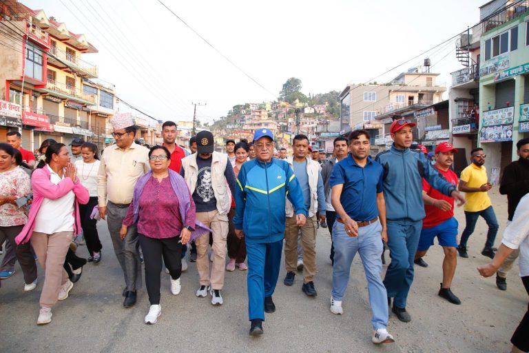 ‘प्रचण्ड’ सहितको मध्यपहाडी लोकमार्ग अभियानको टिम डडेल्धुराको सदरमुकाम अमरगढीमा मर्निङ वाकमा