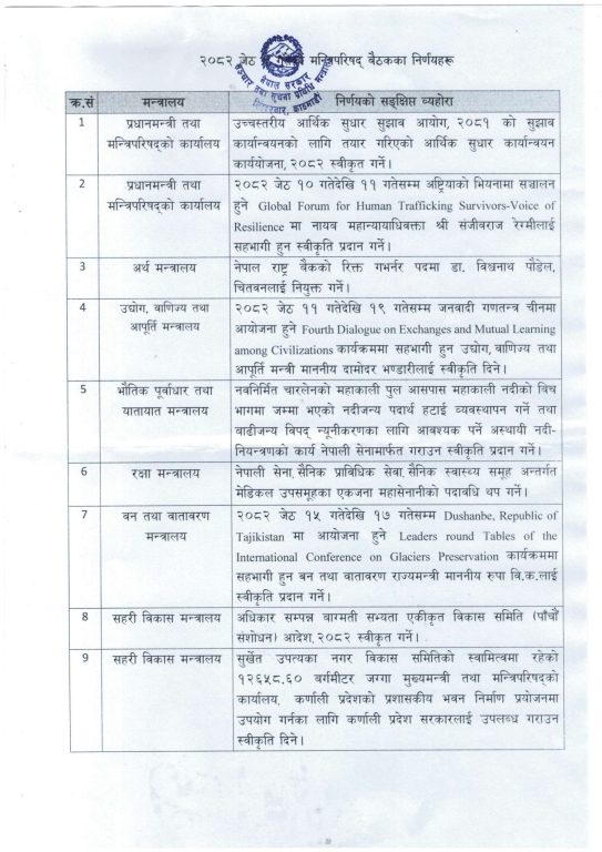 त्यस्तै सरकारले राष्ट्र बैंकको गभर्नरमा विश्वनाथ पौडेलाई नियुक्त गर्नेलगायतका विभिन्न ९ निर्णय गरेको छ।