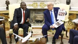 अन्तमा, स्तब्ध दक्षिण अफ्रिकी राष्ट्रपति हेरिरहँदा, ट्रम्पले कागजातहरूको खात देखाउन शुरू गरे । उनले दक्षिण अफ्रिकामा श्वेत पीडितहरूको हिंसाको विवरण भएको देखिन्थ्योः ती कागजका फोटाहरु टेबलमा फाल्दै ट्रम्पले भने “मृत्यु, मृत्यु, मृत्यु,” ।