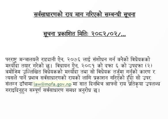 काठमाडौ ८ जेठ । परराष्ट्र मन्त्रालयले राहादनी ऐन, २०७६ लाई संशोधन गर्न बनेको विधेयकको मस्यौदामा सर्वसाधरणको राय मागेको छ।