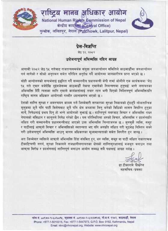प्रवक्ता टीकाराम पोख्रेलले आज निकाल्नुभएको विज्ञप्तिमा आयोगले प्रधानमन्त्री ओलीको अभिव्यक्ति चिन्ताजनक भन्दै उत्तेजित अभिव्यक्ति नदिन भनेको छ । नवराज सुवेदी नेतृत्वको संयुक्त जनआन्दोलन समितिले जेठ १५ गते काठमाण्डौमा जनआन्दोलन शुरू गर्ने घोषणा गरेको छ । त्यही कार्यक्रमलाई लक्षित गर्दै प्रधानमन्त्री ओलीले हिजो आयोजित एक कार्यक्रममा जेठ १५ गते काठमाण्डौ एमालेको कब्जामा हुनुपर्ने बताउनुभएको थियो ।