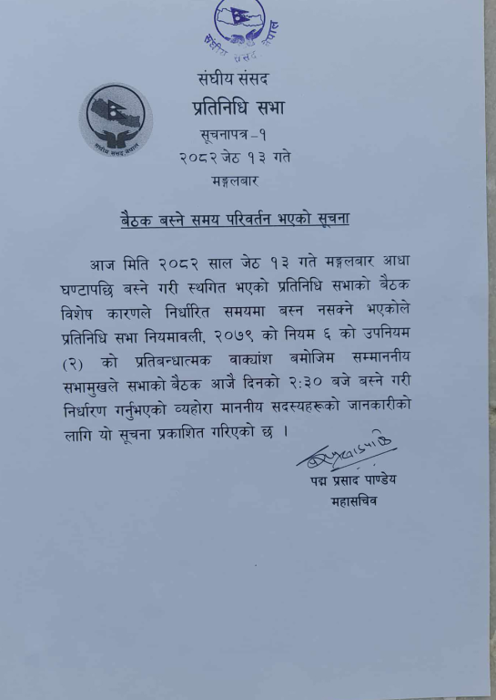 संसद् सञ्चालनमा जुटेन सहमति, सूचना टाँसेर साढे २ बजेसम्म स्थगित
