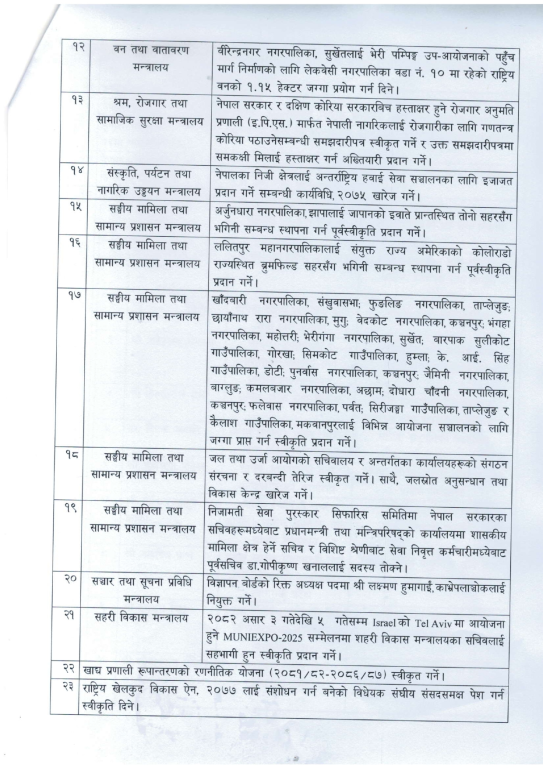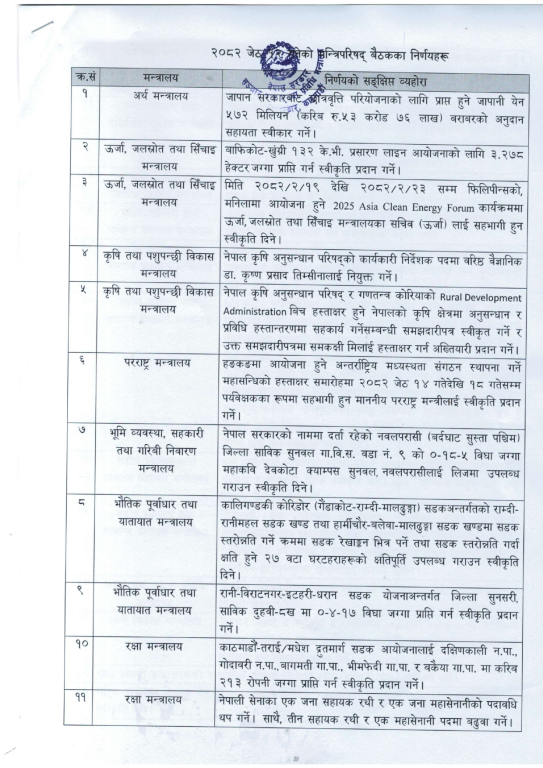 सरकारले राष्ट्रिय खेलकुद विकास ऐन, २०७७ लाई संशोधन गर्न बनेको विधेयक संघीय संसदसमक्ष पेस गर्न स्वीकृति दिने, सूचना प्रविधि तथा साइबर सुरक्षा सम्बन्धमा व्यवस्था गर्न बनेको विधेयक संघीय संसदसमक्ष पेश स्वीकृति दिने, सार्वजनिक सेवा प्रशारण नियमावली, २०८२ स्वीकृत गर्ने लगायतका २८ निर्णय गरेको छ।