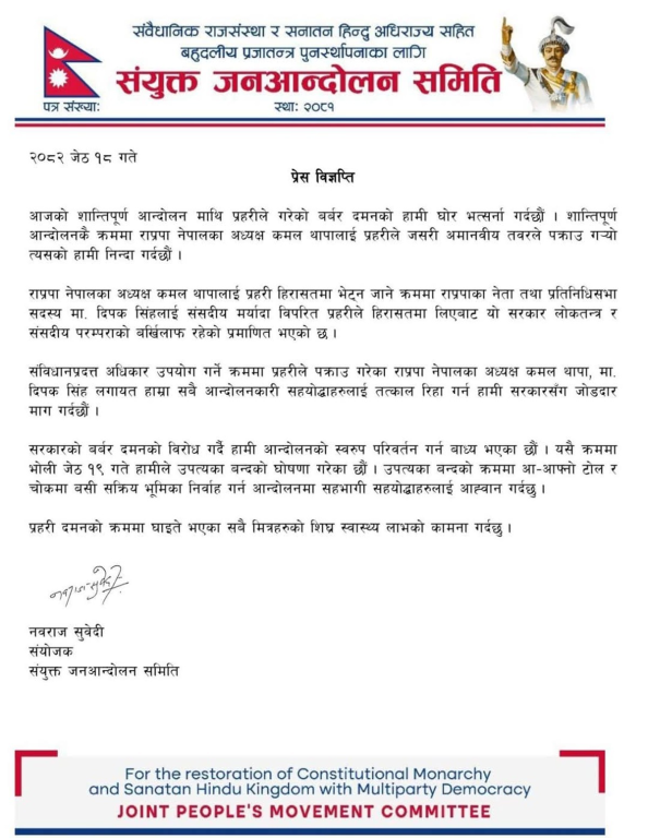 ‘सरकारको बर्बर दमनको विरोध गर्दै हामी आन्दोलनको स्वरूप परिवर्तन गर्न बाध्य भएका छौं। यसै क्रममा जेठ १९ (सोमबार) गते हामीले उपत्यका बन्द घोषणा गरेका छौं। उपत्यका बन्दको क्रममा आ–आफ्नो टोल र चोकमा बसी सक्रिय भूमिका निर्वाह गर्न आन्दोलनमा सहभागी सहयोद्धाहरूलाई आह्वान गर्छु,’ विज्ञप्तिमा भनिएको छ।
