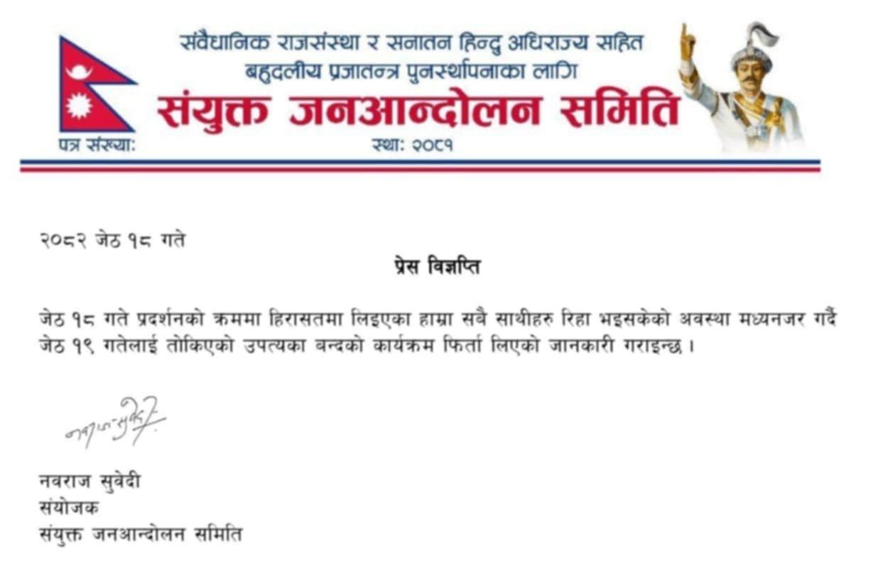 समितिले संयोजक नवराज सुवेदीले हस्ताक्षर गरेको एक विज्ञप्ति जारी गर्दै कार्यक्रम फिर्ता लिएको जनाएको हो। आइतबारको प्रर्दशनको क्रममा हिरासतमा लिइएका नेताहरू रिहा भइसकेको भन्दै समितिले बन्द कार्यक्रम फिर्ता लिएको विज्ञप्तिमा उल्लेख गरिएको छ।