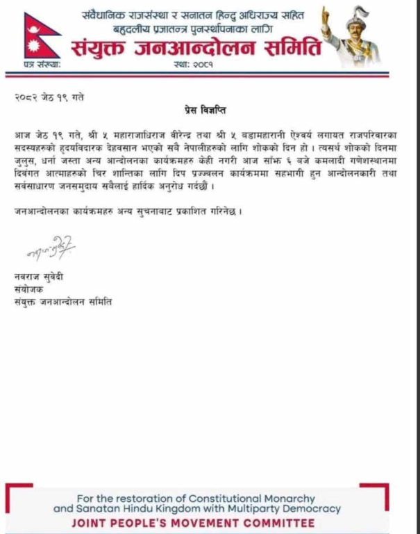 संयोजक सुवेदीले विज्ञप्ति जारी गर्दै राजा वीरेन्द्रको परिवारको हत्या भएको स्मृतिमा आज आन्दोलन नगरी शोक मनाउने उल्लेख गरेका छन्। राजा वीरेन्द्रको परिवारको २०५८ जेठ १९ गते नारायणहिटी दरबारमा हत्या भएको थियो।आज आन्दोलनका कार्यक्रम नगरी साँझ ६ बजे कमलादीस्थित गणेशस्थानमा दीपप्रज्ज्वलन गरिने संयोजक सुवेदीले बताएका छन्।
