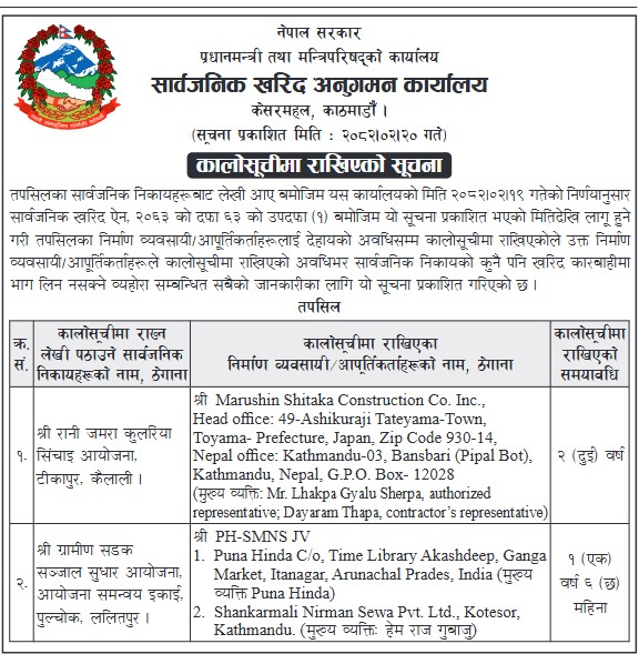 कार्यालयले आज सूचना जारी गर्दै विभिन्न निकायबाट कालो सूचीमा राख्नको लागि लेखि पठाएअनुसार दुईवटा निर्माण कम्पनीलाई कालो सूचीमा राखिएको जनाएको हो।