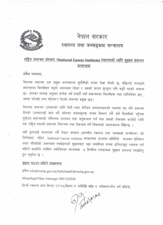 काठमाडौ २१ जेठ । स्वास्थ्य तथा जनसंख्या मन्त्रालयले राष्ट्रिय क्यान्सर संस्थान स्थापनाको लागि सुझाव संकलन सुरु गरेको छ। मन्त्रालयले सार्वजनिक सूचना प्रकाशन गरेर ७ दिन भित्र सबैको रचनात्मक सुझाव माग गरेको छ।