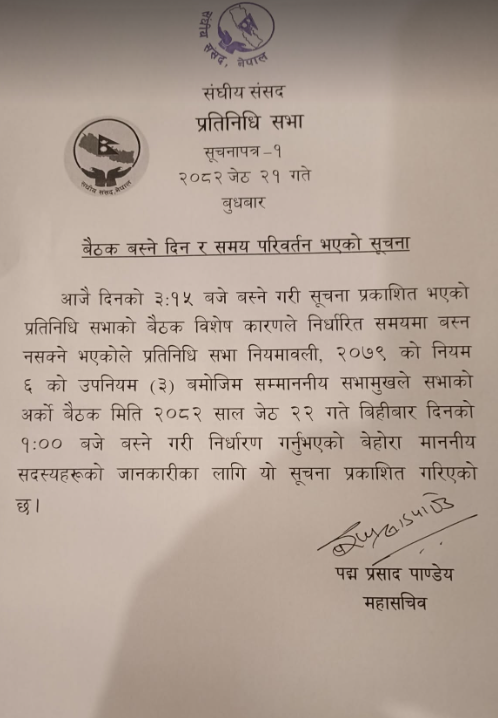 यसअघि मंगलबार पनि बैठक बस्दै नबसी आज दिउँसो १ बजेसम्मका लागि स्थगित भएको सूचना टाँसिएको थियो। भिजिट भिसा प्रकरणमा गृहमन्त्री रमेश लेखकको कनेक्सन रहेको दाबीसहित प्रतिपक्षी दलले उनको राजीनामा र यस प्रकरणमा उच्चस्तरीय छानबिन समिति गठनलाई बटमलाइन बनाउँदै आएका छन्।