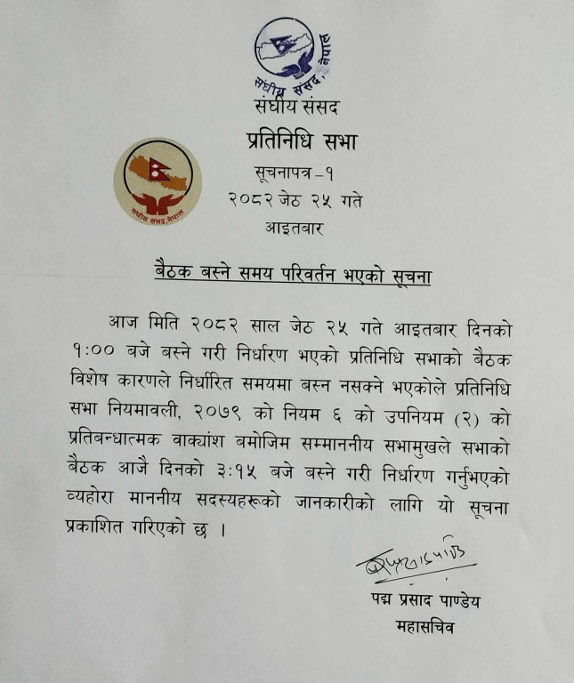 काठमाडौ २५ जेठ । सवा ३ बजे बस्ने गरी सर्यो प्रतिनिधि सभाको बैठक सरेको छ । आजको बैठक दिउँसो १ बजे बस्ने भनिएको थियो । विपक्षी दलहरूको बैठक जारी रहेकाले बैठक सारिएको सभामुखको सचिवालयले जनाएको छ ।