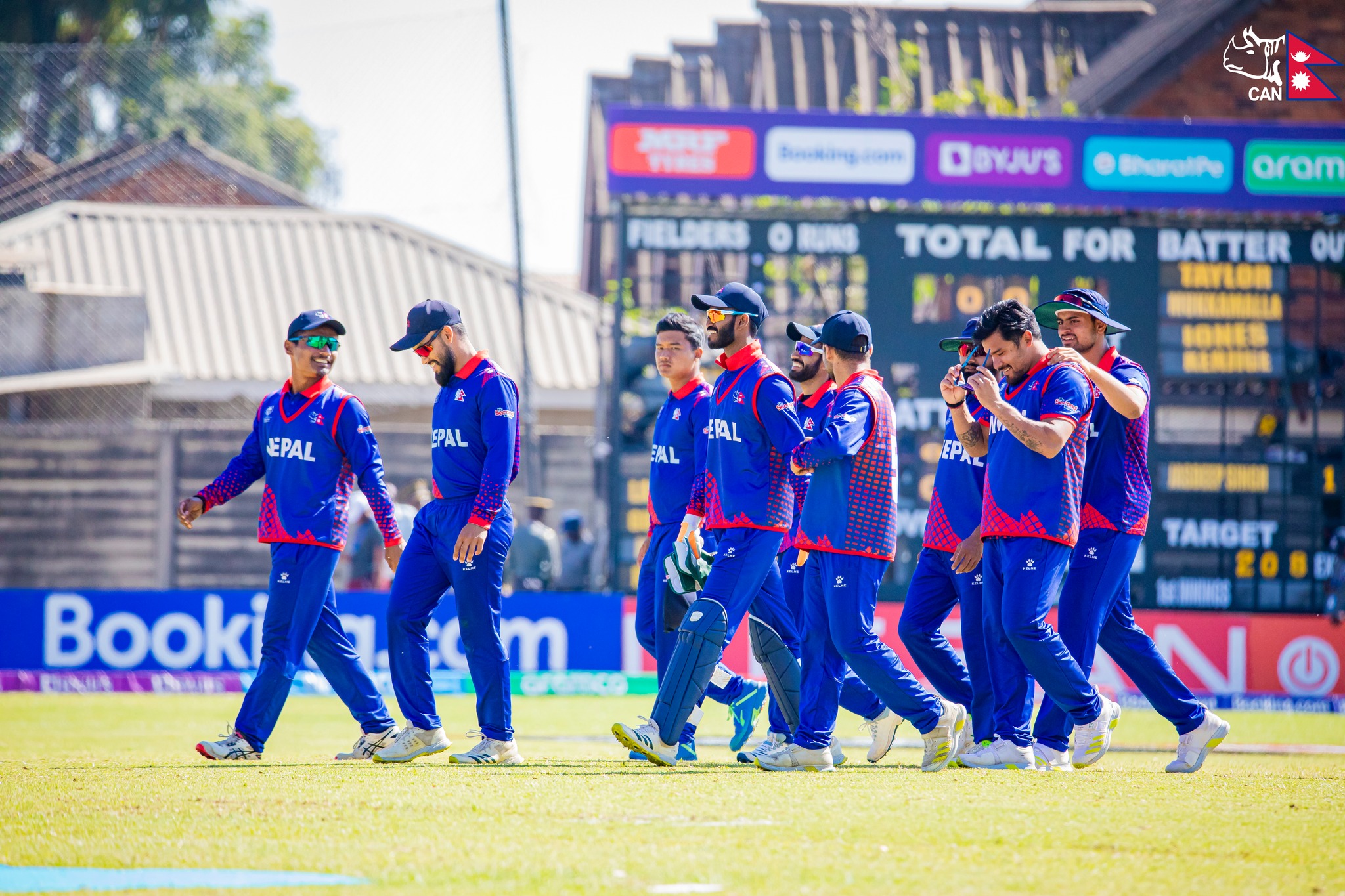 नेपालका लागि भिम सार्कीले सर्वाधिक ७३ रनको पारी खेले। उनले ८५ बल खेल्दै ८ चौका प्रहार गरे। नेपालले ३।५ ओभरमा ओपनरदेवय कुशल भुर्तेल र आसिफ शेखबिच रन लिने कि नलिने भन्ने निर्णय दुइ मतमा बाँझिदा कुशल भुर्तेल रन आउट भएका हुन्। दुवै ब्याटर एउटै क्रिजमा हुँदा कुशल १७ रन बनाउँदै पेभेलियन फर्किए।