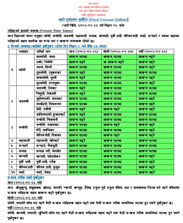 महाशाखाका अनुसार आगामी ३ दिन कोसी नारायणी कर्णाली महाकाली र यसका प्रमुख सहायक नदीहरू साथै पूर्वी राप्ती पश्चिम राप्ती कन्काई, कमला। बागमती र बबई नदीको जलसतह सतर्कता तह तलै रहने सम्भावना रहे पनि घटबढ भइरहने देखिएकाले नदी तटीय क्षेत्रका क्रियाकलापमा सामान्य सतर्कता आवश्यक देखिन्छ।