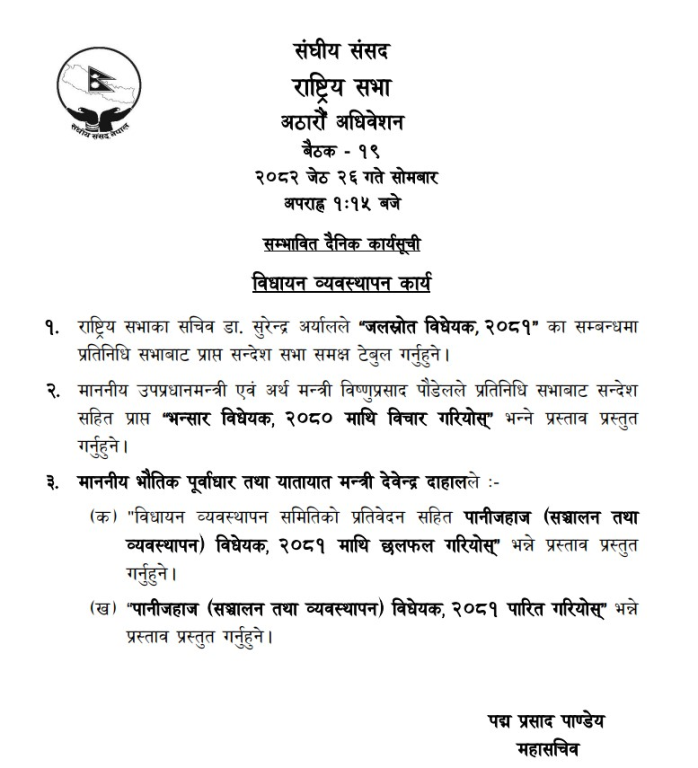आजको बैठकमा भौतिक पूर्वाधार तथा यातायात मन्त्री देवेन्द्र दाहालले पानीजहाज विधेयक, २०८१ माथि छलफल र पारित गर्ने प्रस्ताव पेश गर्ने कार्यसूची पनि छ।