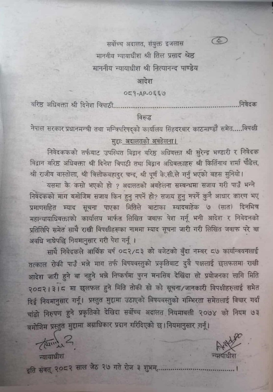 काठमाडौ २८ जेठ । वरिष्ठ अधिवक्ता दिनेश त्रिपाठीले प्रधानमन्त्री केपी शर्मा ओलीसमेत विरुद्ध दायर गरेको अवहेलना मुद्दामा सर्वोच्च अदालतले असार ८ गते सुनुवाइको मिति तोक्दै अग्राधिकार प्रदान गरेको छ । गत आइतबार आगामी आर्थिक वर्ष २०८२र८३ को बजेटमार्फत अदालतको अवहेलना गरेको भन्दै प्रधानमन्त्रीसहित चार मन्त्रीलाई पदमुक्त गरी भविष्यमा सार्वजनिक पद धारण गर्न अयोग्य घोषित गर्न मागसहितको रिट सर्वोच्चमा दायर भएको थियो ।