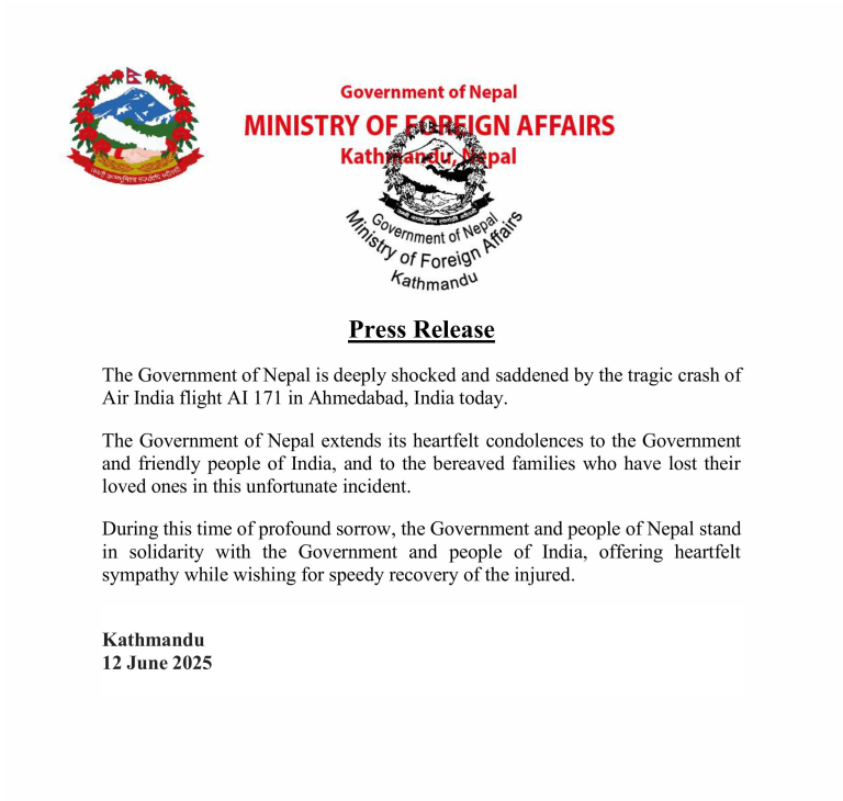 काठमाडौ २९ जेठ । भारतको अहमदाबादमा भएको विमान दुर्घटनाप्रति सरकारले दुःख व्यक्त गरेको छ।