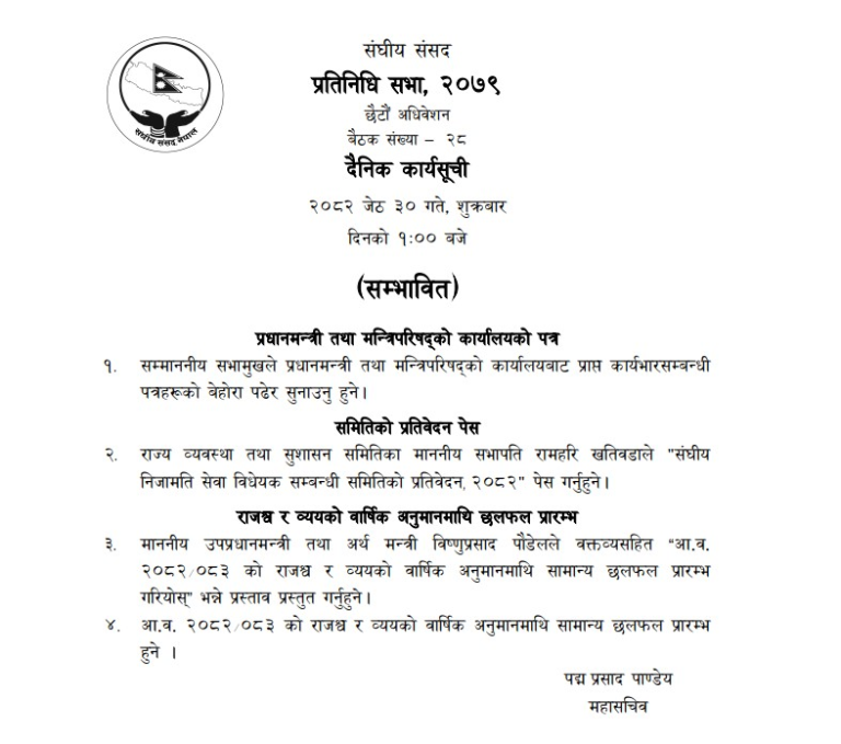 बैठक शुक्रबार अपराह्न ३ बजे बस्नेगरी समय निर्धारण गरिएको संसद् सचिवालयले जनाएको छ।