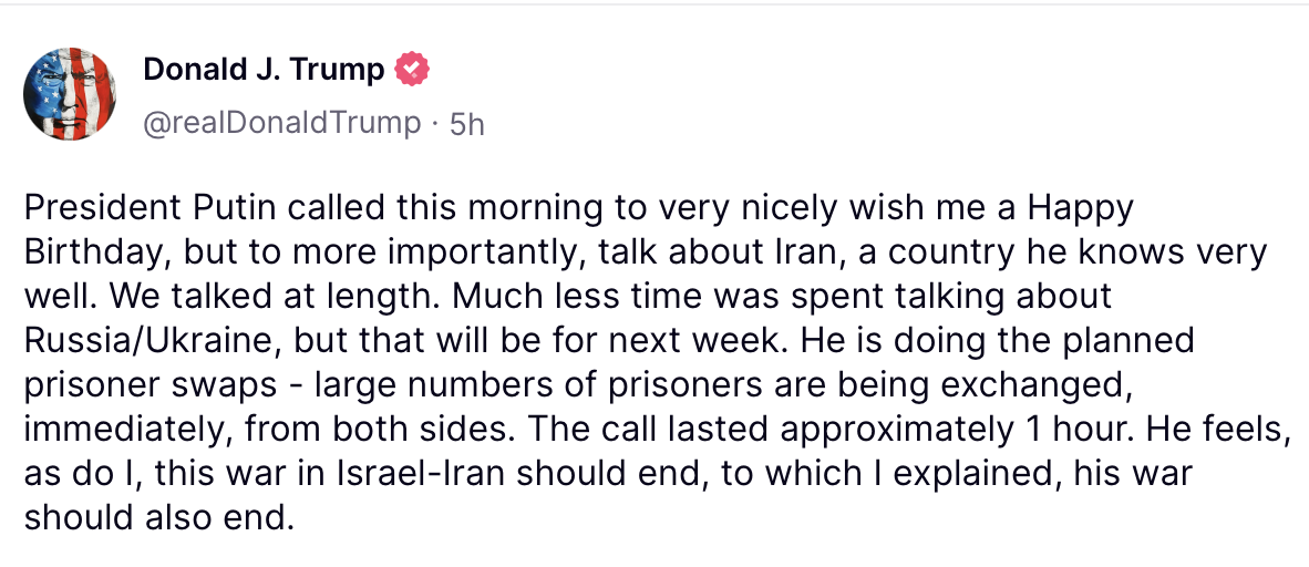 दुई नेताले युक्रेन द्वन्द्वबारे ‘धेरै कम समय’ छलफल गरेको उनले उल्लेख गरे, । यो विषय ‘अर्को हप्ता’ का लागि छोडिएको बताए। ‘कुराकानी करिब एक घण्टा चल्यो। उनले, र मैले पनि, इजरायल–इरान युद्ध अन्त्य हुनुपर्छ भन्ने महसुस गरेका छौं, जसमा मैले उनलाई उनको युद्ध पनि अन्त्य हुनुपर्छ भनेर सम्झाएँ’ ट्रम्पले लेखेका छन् ।
