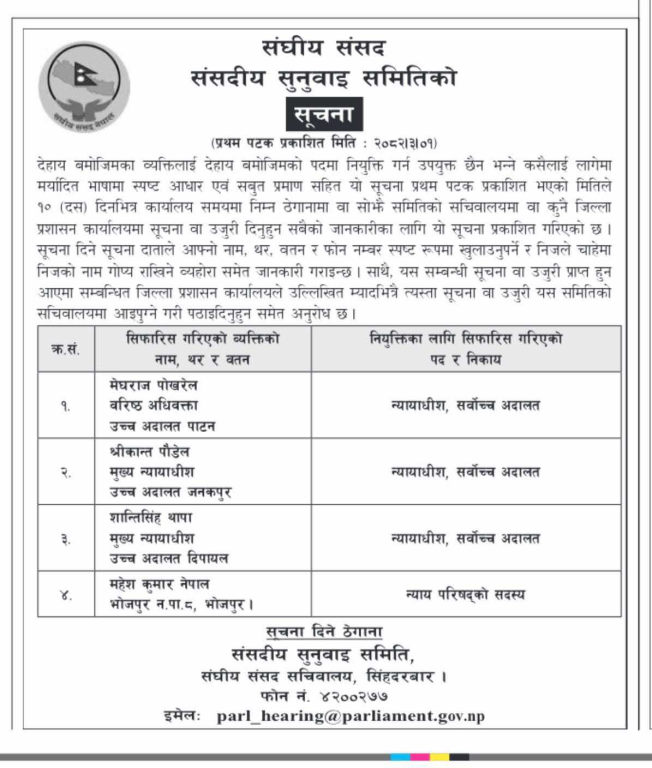 काठमाठौ १ असार । संघीय संसद् अन्तर्गतको संसदीय सुनुवाइ समितिले सर्वोच्च अदालतमा सिफारिस भएका तीन न्यायाधीश र न्याय परिषद्मा सिफारिस एकजना सदस्यमा उजुरी आह्वान गरेको छ।