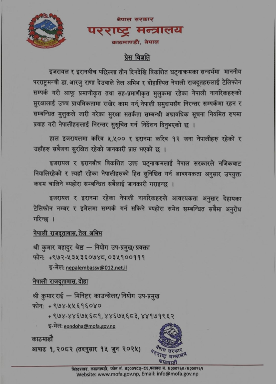 इजरायलमा ५५ सय र इरानमा रहेका १२ जना नेपाली सुरक्षित छन्- परराष्ट्र मन्त्रालय