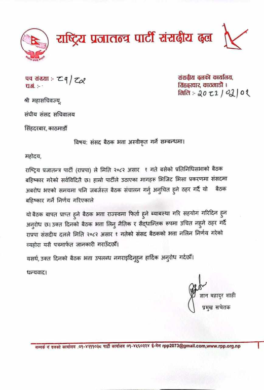 राप्रपा प्रमुख सचेतक ज्ञानेन्द्र शाहीले संसद् सचिवालयलाई पत्र लेख्दै हिजोको बैठक भत्ता राजस्वमै फिर्ता हुने व्यवस्था मिलाइदिन आग्रह गरेका छन्।