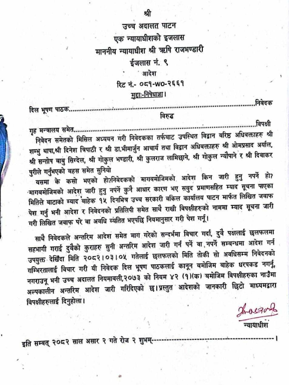 आदेशमा लेखिएको छ, ‘निवेदकले अन्तरिम आदेशसमेत माग गरेको सन्दर्भमा विचार गर्दा दुवै पक्षलाई छलफलमा सहभागी गराई दुवैको कुराहरू सुनी अन्तरिम आदेश जारी गर्न पर्ने वा नपर्ने सम्बन्धमा आदेश गर्न उपयुक्त देखिँदा मिति २०८२।०३।०५ गतेलाई छलफलको मिति तोकी सो अवधिसम्म निवेदनको गम्भीरतालाई विचार गरी यी निवेदक दिलभूषण पाठकलाई कानुनबमोजिम बाहेक धरपकड नगर्नू, नगराउनू भनी उच्च अदालत नियमावली, २०७३ को नियम ४२ ९१० ९क० बमोजिम विपक्षीहरूका नाउँमा अल्पकालीन अन्तरिम आदेश जारी गरिदिएको छ। प्रस्तुत आदेशको जानकारी छिटो माध्यमद्वारा विपक्षीहरूलाई दिनुहोला।’