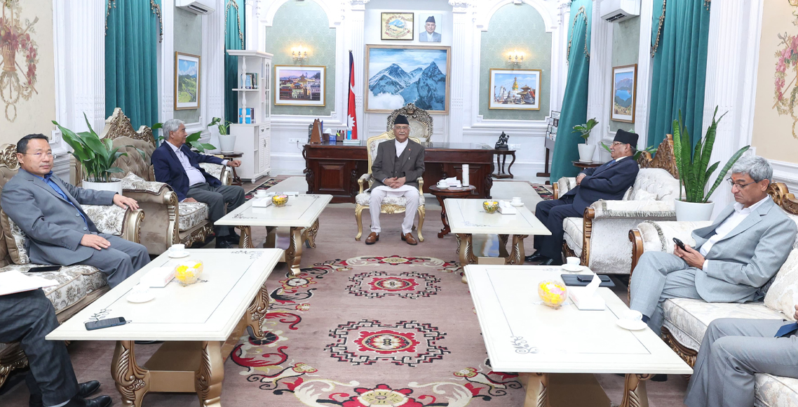 प्रधानमन्त्री तथा मन्त्रिरिषद्को कार्यालय, सिंहदरबारमा जारी बैठकमा प्रधानमन्त्री एवं नेकपा एमालेका अध्यक्ष ओली, नेपाली कांग्रेसका सभापति एवं पूर्वप्रधानमन्त्री शेरबहादुर देउवा, नेकपा माओवादी केन्द्र का अध्यक्ष एवं पूर्व प्रधानमन्त्री पुष्पकमल दाहाल ‘प्रचण्ड’ लगायत नेताहरू सहभागी छन्।