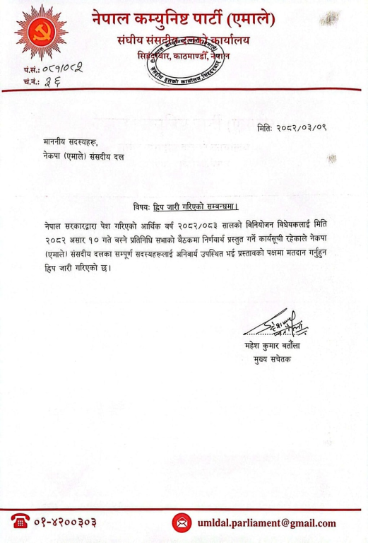 बजेटकाे पक्षमा मतदान गर्न एमाले ‘ह्वीप’