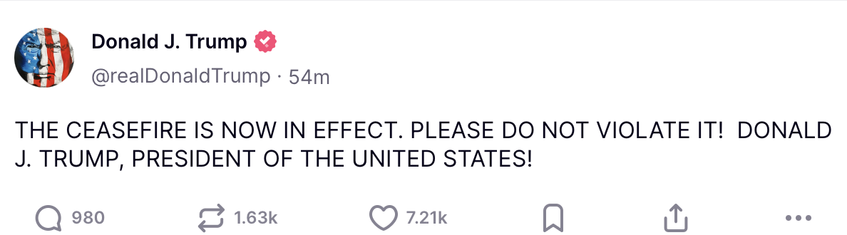 यसैबीच अमेरिकी उपराष्ट्रपति जेडी भान्सले ट्रम्पको पोस्टलगत्तै भनेका छन् युद्ध ‘प्रभावकारी रूपमा समाप्त’ भएको छ र अब ‘वास्तविक शान्ति प्रक्रिया पुनः सुरु गर्ने अवसर’ छ।
