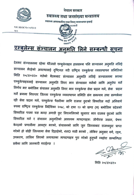 स्वास्थ्य आपतकालीन तथा विपद् व्यवस्थापन इकाईअन्तर्गतको राष्ट्रिय एम्बुलेन्स व्यवस्थापन समितिको २०८२ जेठ ३० गते बसेको बैठकले एम्बुलेन्सहरूले अनिवार्य रूपमा संचालन अनुमति लिनुपर्ने निर्णय गरेको थियो।