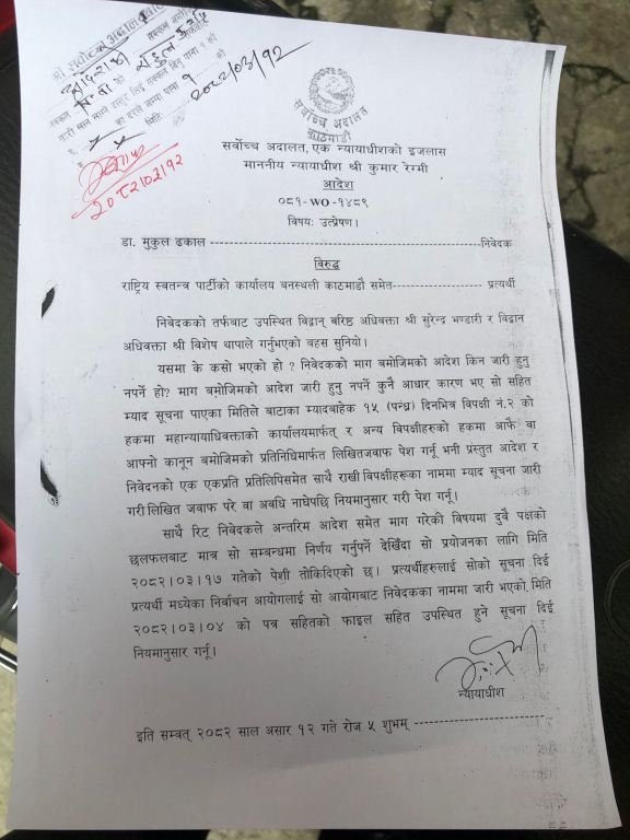 काठमाडौ १२ असार । आफूलाई राष्ट्रिय स्वतन्त्र पार्टीको महामन्त्री पदमा फर्काउन माग गर्दै डा। मुकुल ढकालले दायर गरेको रिट निवेदन सुनुवाइ गर्दै सर्वोच्च अदालतले रास्वपासहितका विपक्षीहरुलाई छलफलमा बोलाएको छ।