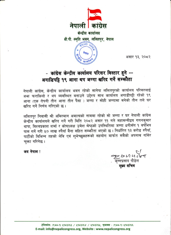 ललितपुरकै अमिरमान अमात्यको नाममा रहेको सो जग्गा र घर नेपाली कांग्रेस केन्द्रीय कार्यालयले खरिद गर्न असार ११ गते महामन्त्रीद्वय गगनकुमार थापा, विश्वप्रकाश शर्मा र कोषाध्यक्ष उमेश श्रेष्ठले सम्झौता गरेका हुन्।