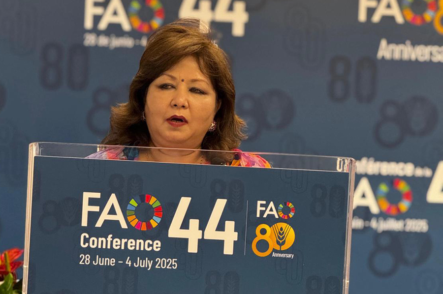 रोममा आयोजित राष्ट्रसङ्घीय खाद्य तथा कृषि सङ्गठनको ४४औँ महासभालाई सोमबार सम्बोधन गर्दै उहाँले जलवायु परिवर्तनको मार खेपिरहेका नेपाल र यहाँका विशेषगरी हिमाली क्षेत्रका लागि अनुदानमा आधारित अन्तरराष्ट्रिय जलवायु वित्त सुनिश्चित गर्न आग्रह गरिन् ।