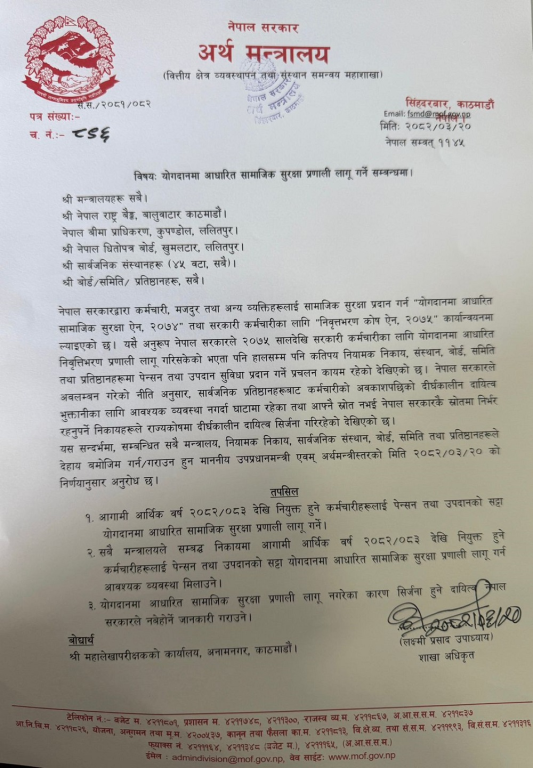 काठमाडौ २० असार । आर्थिक वर्ष २०८२र०८३ देखि नियुक्त हुने कर्मचारीहरूलाई पेन्सन तथा उपदानको सट्टा योगदानमा आधारित सामाजिक सुरक्षा प्रणाली लागू हुने भएको छ।