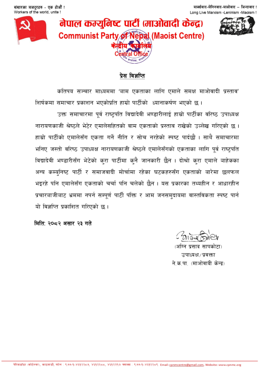 कतिपय सञ्चार माध्यममा ‘बाम एकताका लागि एमाले समक्ष माओवादी प्रस्ताव’ भन्ने समाचारको खण्डन गर्न प्रवक्ता अग्नि सापकोटाले जारी गरेको विज्ञप्तिमा भनिएको छ( हाम्रो पार्टीको एमालेसँग एकता गर्ने नीति र सोच नरहेको स्पष्ट पार्दछौँ।