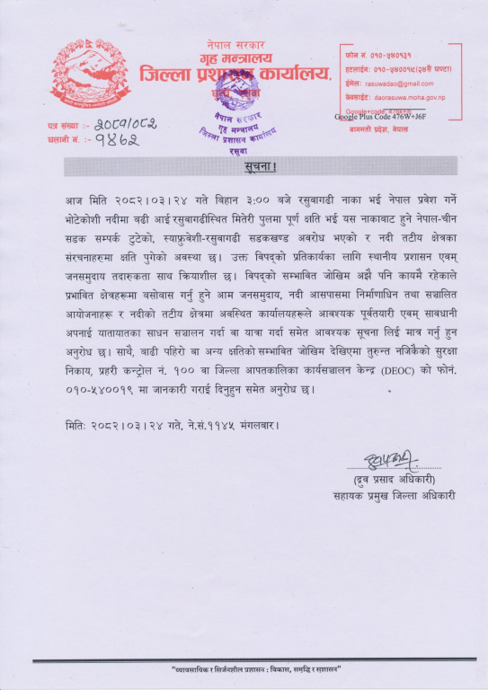 साथै बाढी(पहिरो वा अन्य क्षतिको सम्भावित जोखिम देखिएमा तुरुन्त नजिकैको सुरक्षा निकाय, प्रहरी कन्ट्रोल नं। १०० वा जिल्ला आपत्कालीन कार्यसञ्चालन केन्द्र ९डीईओसी० को फोनं। ०१०(५४००१९ मा जानकारी गराई गराउनसमेत सहायक प्रमुख जिल्ला अधिकारी अधिकारीले अनुरोध गरेका छन्।
