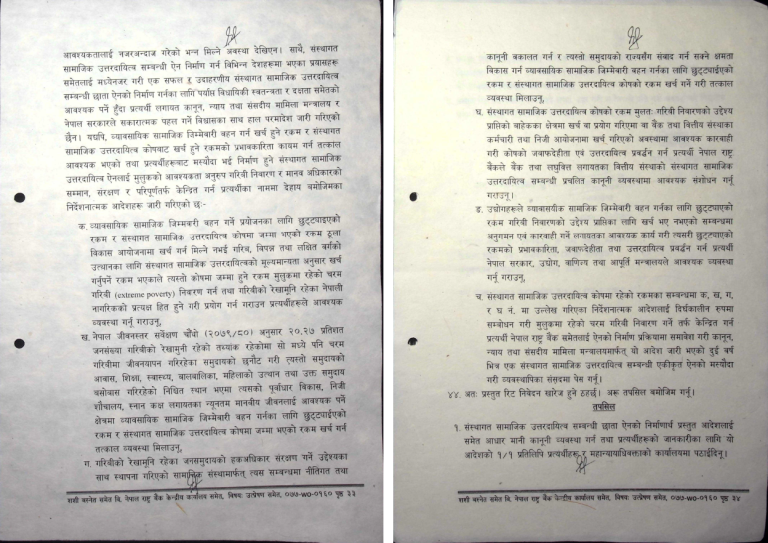 सर्वोच्चले मुलुकको चरम गरिबी निवारण गर्न त्यस्ता कोषको रकम खर्चिनुपर्ने भन्दै नयाँ सामाजिक उत्तरदायित्व सम्बन्धी ऐनको मस्यौदा गर्न कानुन मन्त्रालयलाई आदेश दिएको हो । उसले दुई वर्षको समयसीमा दिँदै कानुन निर्माणमा राष्ट्र बैंकलाई पनि सहभागी गराउनू भनेको छ ।