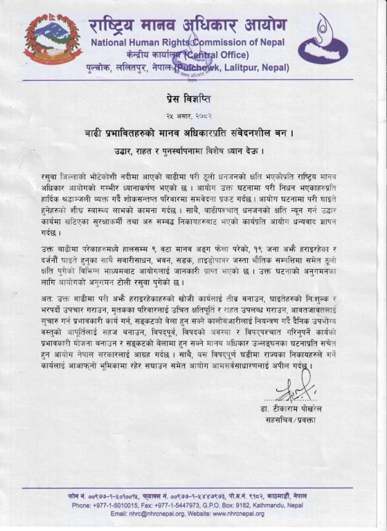 काठमाडौ २६ असार । राष्ट्रिय मानवअधिकार आयोगले रसुवाको भोटेकोशी नदीमा आएको बाढीमा हराइरहेकाको खोजीलाई तीव्र बनाउन, घाइतेको निःशुल्क उपचार, राहत र पुनर्स्थापनामा ध्यान दिन आग्रह गरेको छ ।