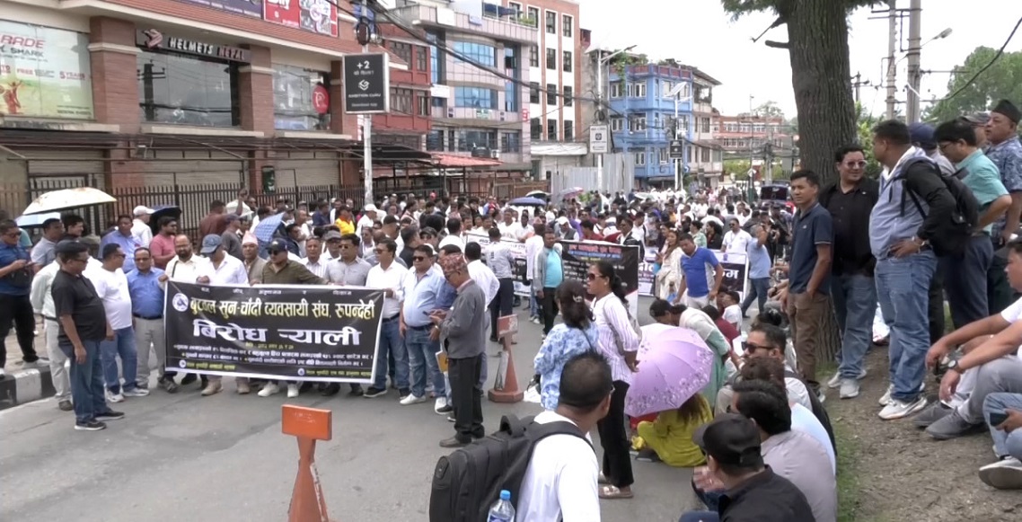 ‘२ प्रतिशत विलासिता कर र १३ प्रतिशत भ्याट उपभोक्तालाई भार हो’, ‘सुन तथा सुनका गहनामा लागू गरिएको २ प्रतिशत विलासिता कर खारेज गर’, ‘सुनको भन्सार दर ६ प्रतिशत कायम गर’ लगायतका नारासहित प्रदर्शन गरेका हुन्।
