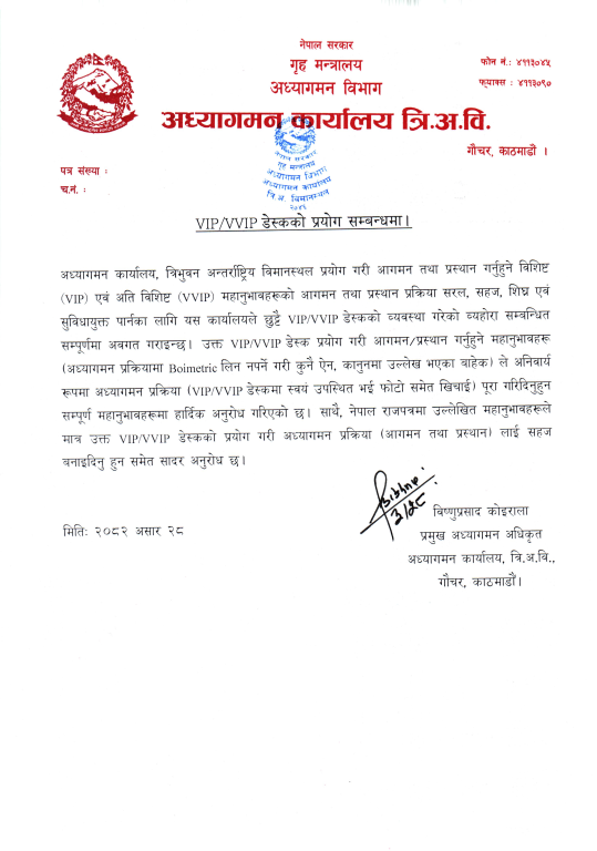 त्रिभुवन अन्तर्राष्ट्रिय विमानस्थल प्रयोग गरी आगमन तथा प्रस्थान गर्नुहुने विशिष्ट एवं अति विशिष्ट महानुभावहरूको आगमन तथा प्रस्थान प्रक्रिया सरल, सहज, शीघ्र एवं सुविधायुक्त पार्नका लागि यस कार्यालयले छुट्टै भीआईपीरभीभीआईपी डेस्कको व्यवस्था गरेको व्यहोरा सम्बन्धित सम्पूर्णमा अवगत गराइन्छ,ु कार्यालयको सूचनामा उल्लेख छ।