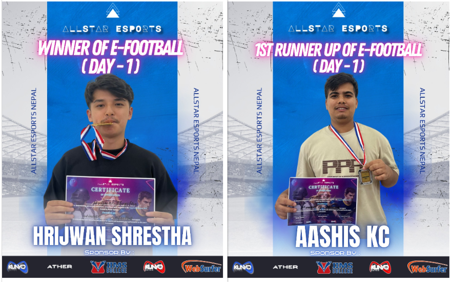 काठमाडौं, ३० असार । अलस्टार ई स्पोर्टसले आयोजना गरेको ई स्पोर्टस सोडाउन –२०२५ अन्तरगत एक दिने ई स्पोर्टस फुटवलमा रिजवान श्रेष्ठ विजयी भएका छन् । आशिष केसी उपविजेता बनेका छन् । त्यसैगरि, पब्जी मोवाइल, मोवाइल लेजेन्स खेल भने जारी छ । खेल असार ३१ गतेसम्म संचालन हुनेछ । खेलमा विजेतालाई नगद पुरस्कार सहित मेडल सटिफिकेटस्, ट्रफीले सम्मान गरिएको आयोजकले जनाएको छ ।