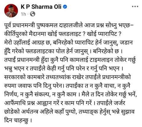सामाजिक सञ्जाल फेसबुकमा लेख्दै प्रधानमन्त्री ओलीले प्रचण्ड प्रधानमन्त्री हुँदा कुनै वाचा, सङ्कल्प, निर्णय र काम पनि नभएको भन्दै अहिले आफूले आफैँलाई प्रश्न गरेर काम गरिरहेको दाबी गर्नुभएको छ । उहाँले प्रचण्डले जर्जर बनाएर छाडेको अर्थतन्त्र आफूले सुधारेको जिकिर पनि गर्नुभएको छ ।