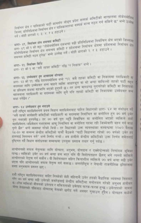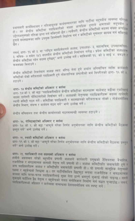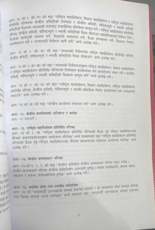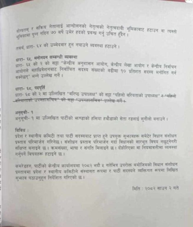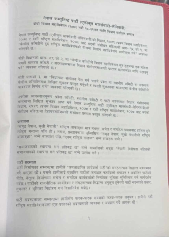 बिहीबार ९साउन १० गते बसेको पार्टी सचिवालय बैठकमा विधान संशोधनको प्रस्तावलाई अन्तिम रूप दिइएको थियो । आगामी भदौ २०–२२ गते एमालेको विधान महाधिवेशन हुँदै छ ।
