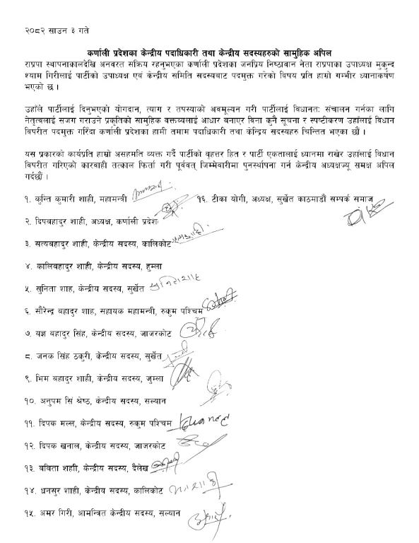 कर्णाली प्रदेशका केन्द्रीय पदाधिकारी तथा केन्द्रीय सदस्यहरूले उपाध्यक्ष गिरीलाई पूर्ववत् अवस्थाकै पदमा फर्काउन माग गर्दै सामूहिक अपिल निकालेका हुन्।