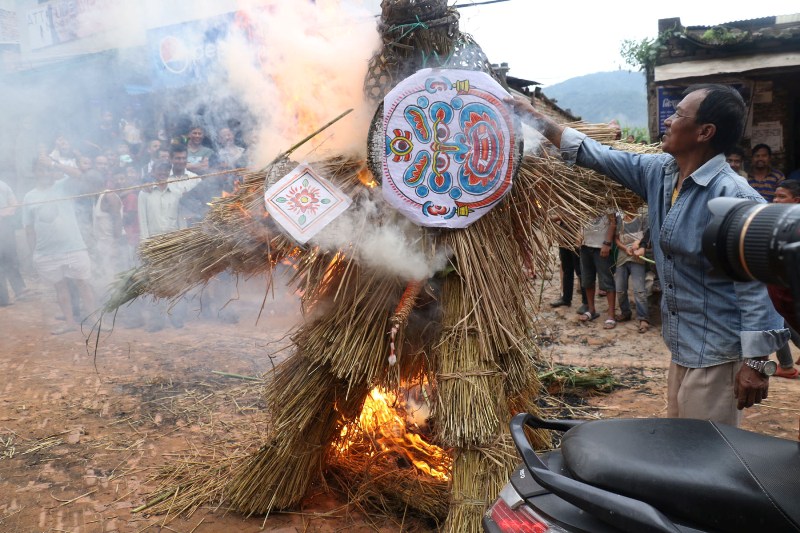 परापूर्वकालदेखि मनाउँदै आएको यो पर्वमा गठामङ्गल नाम गरेको राक्षस मारिएको सम्झनास्वरूप बिहानै हरियो नर्कट, निगालो अथवा गहुँको छ्वाली मिसाएर तीनखुट्टे राक्षसको स्वरूप बनाइ दोबाटो र चौबाटोमा उभ्याइने चलन छ ।