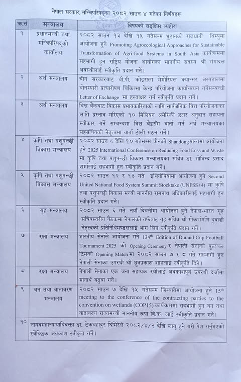 काठमाडौ ७ साउन । सरकारले २०८२ साउन ४ गते बसेको मन्त्रिपरिषद् बैठकले गरेका १० निर्णय सार्वजनिक गरेको छ।